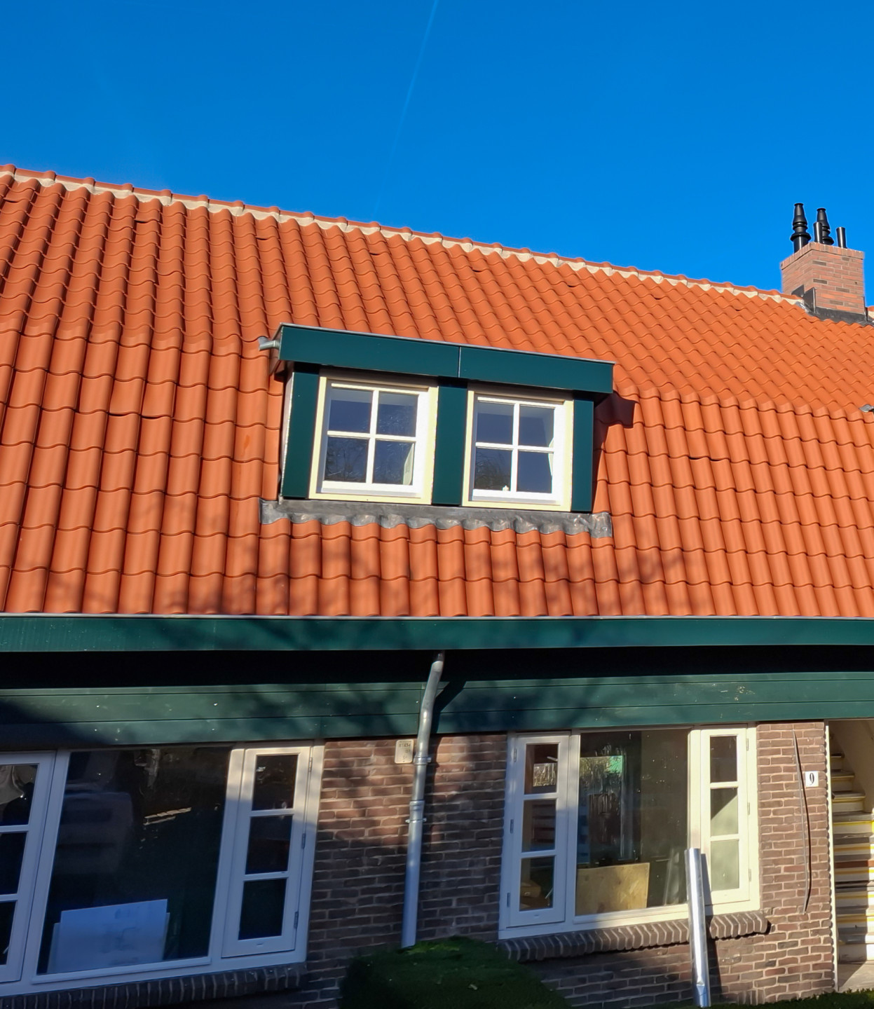 De dakkapellen zijn gemaakt van hardhout en zinken zijwangen. Het boeideel met neuslijst is afgewerkt met een zinken kraal. De spuwers zijn ook van zink. De dakkapellen over 2 woningen hebben tussen de kozijnen en ter hoogte van de woning scheidende muur een constructief en geïsoleerd paneel, bekleed met brandvertragend multiplex. Inclusief voorzieningen ter voorkoming van brandoverslag.